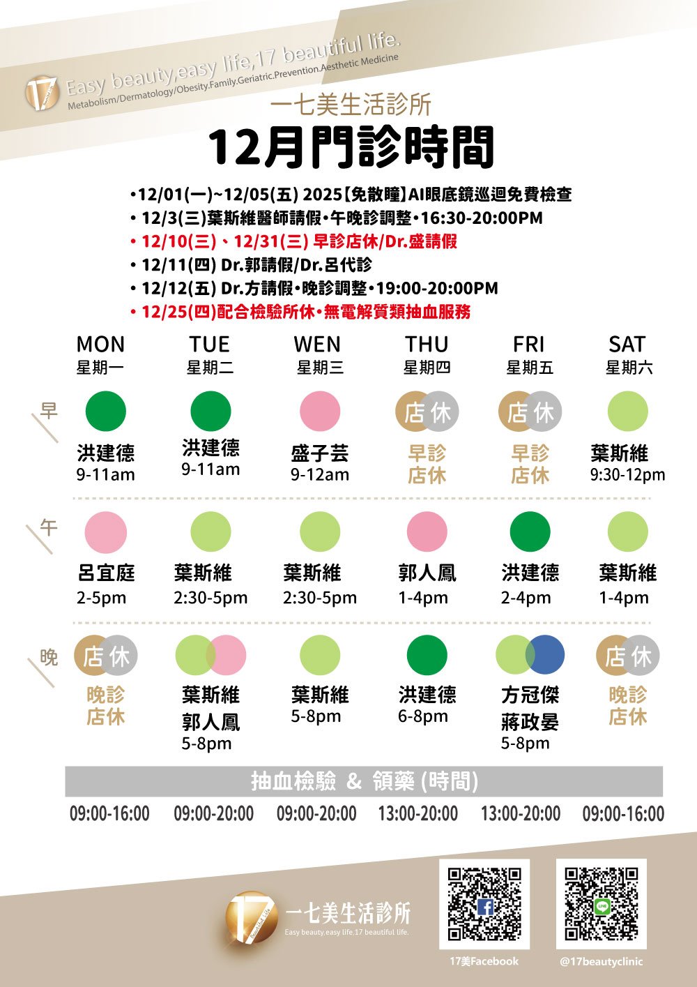 ・ 12/10(三)、12/31(三) 早診店休/Dr.盛請假
